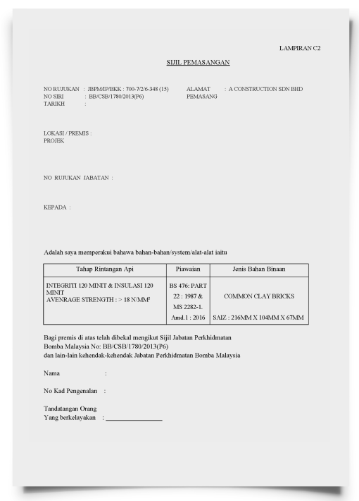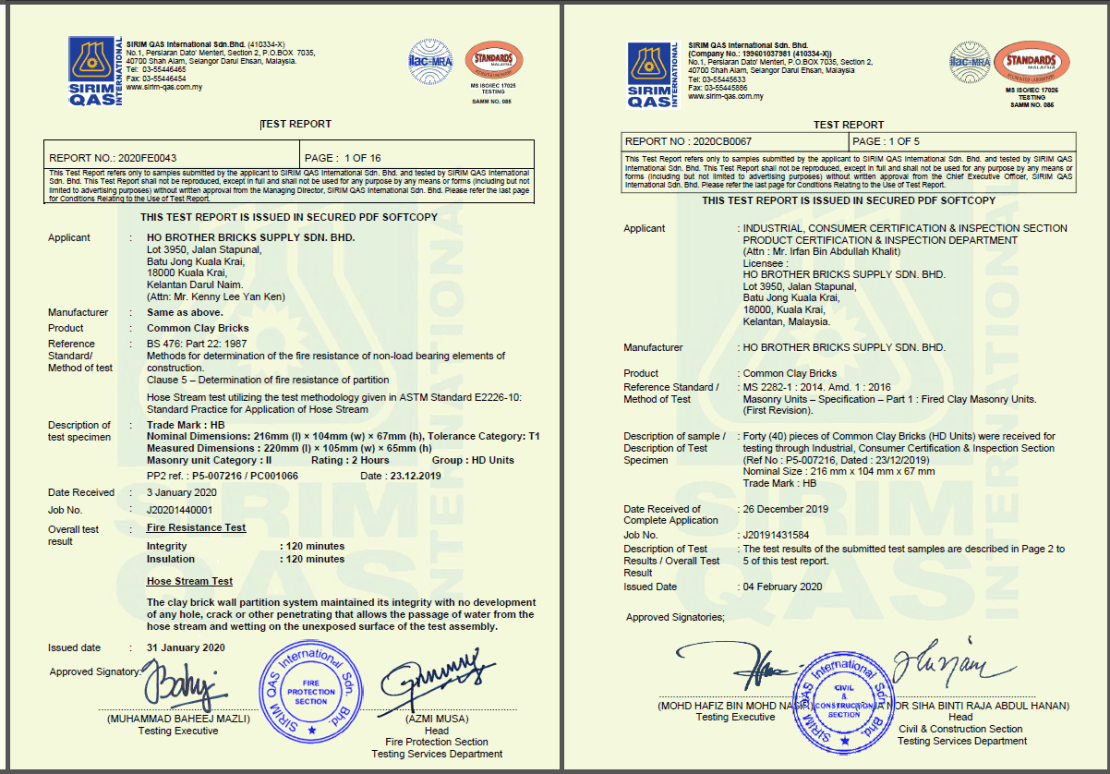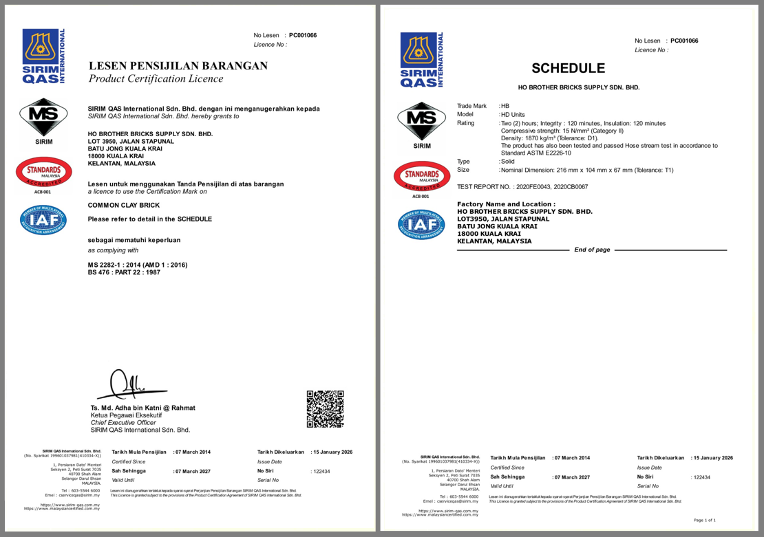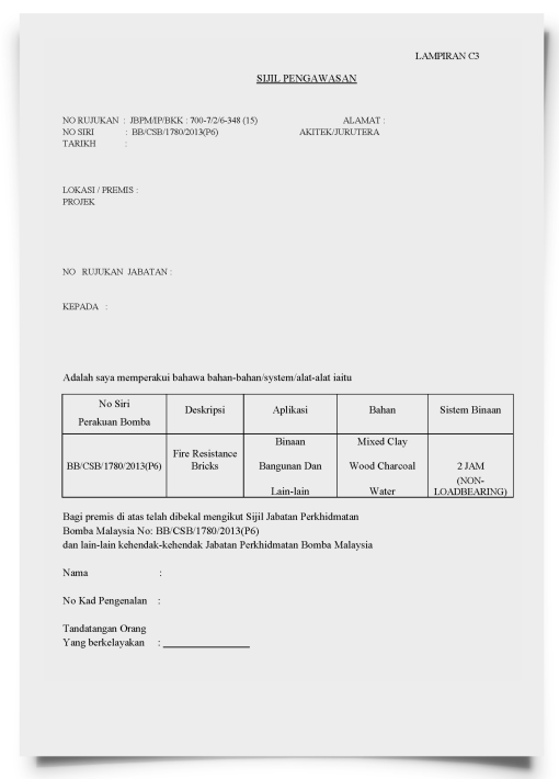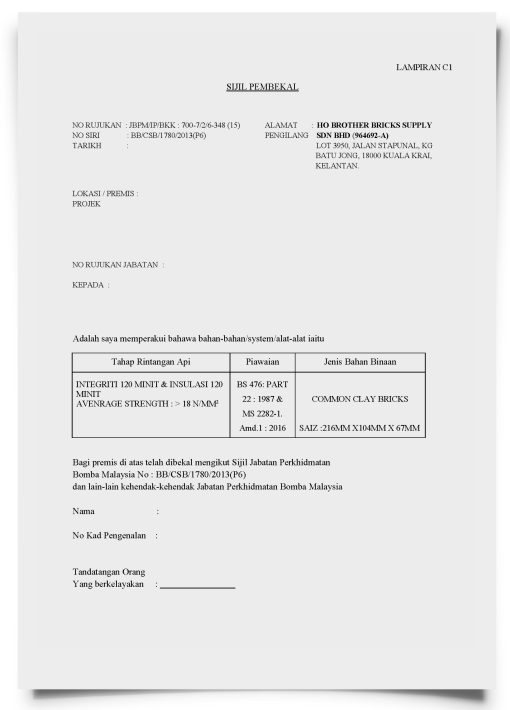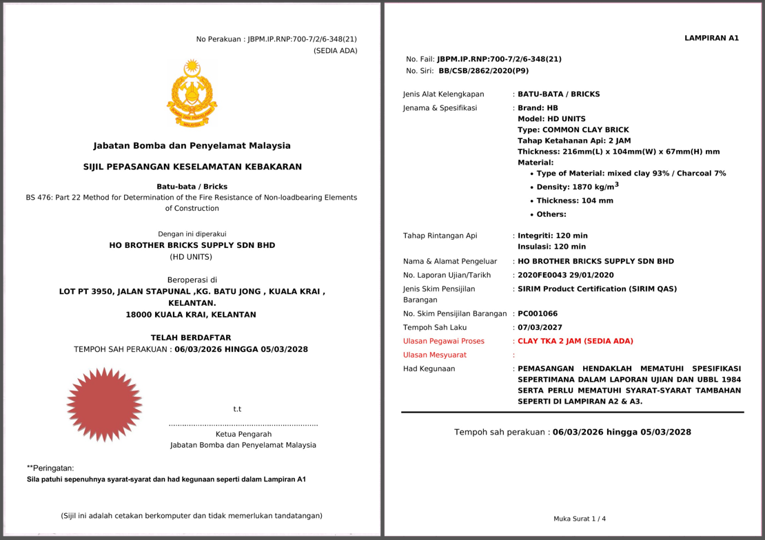 Jabatan Bomba dan Penyelamat Malaysia (Jabatan BOMBA) dengan ini mengiktiraf Ho Brother Bricks Supply Sdn Bhd untuk bahan binaan / peralatan keselamatan kebakaran. Mematuhi berikutnya: